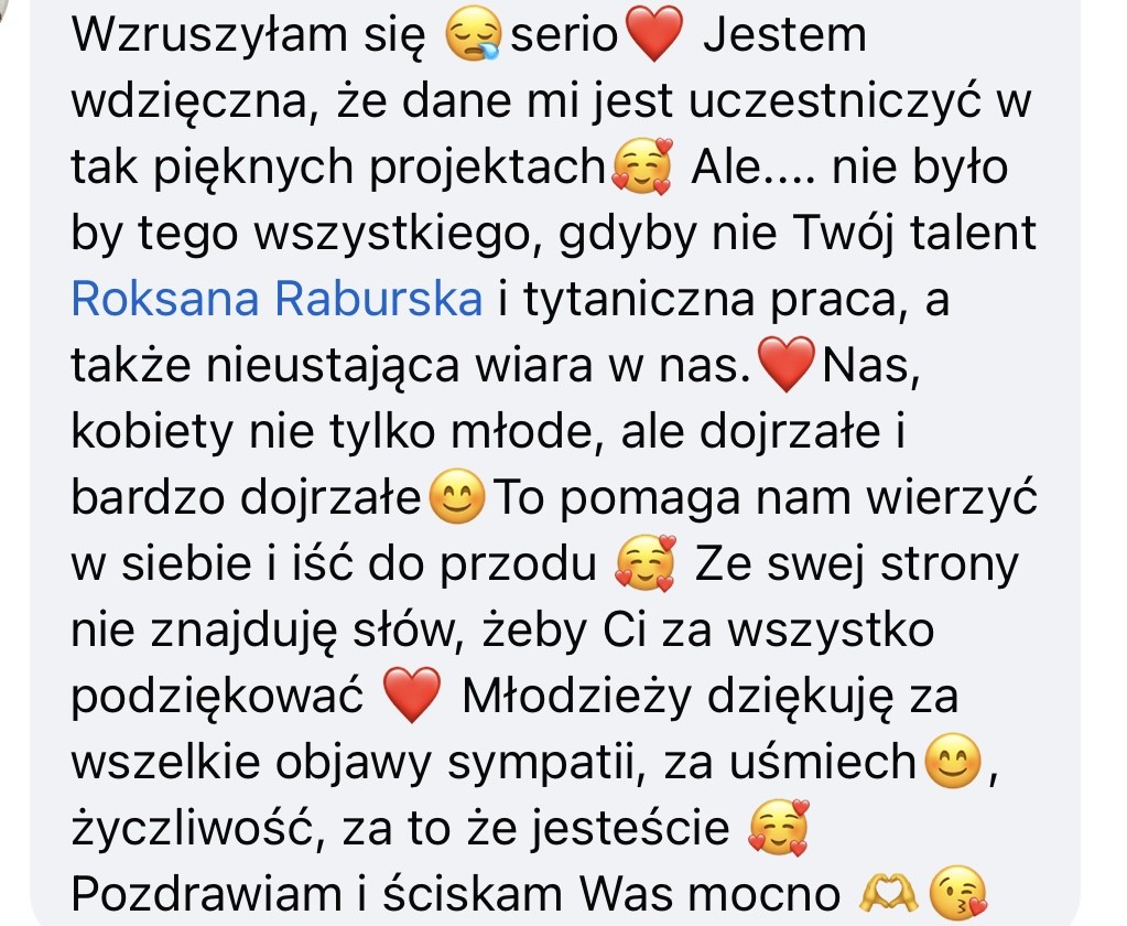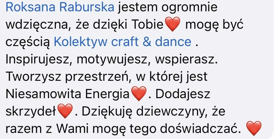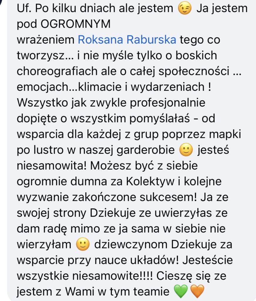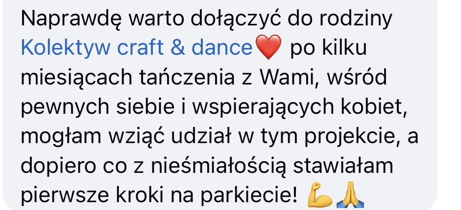 W zamian taniec daje nam więcej, niż moglibyśmy się spodziewać: dostęp do potencjału naszego ciała, zdrowia, sprawnego umysłu, radości, zabawy, rozwoju i poczucia przynależności.